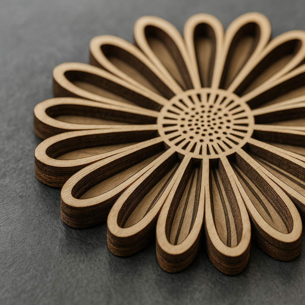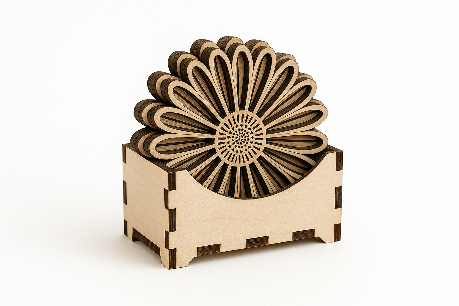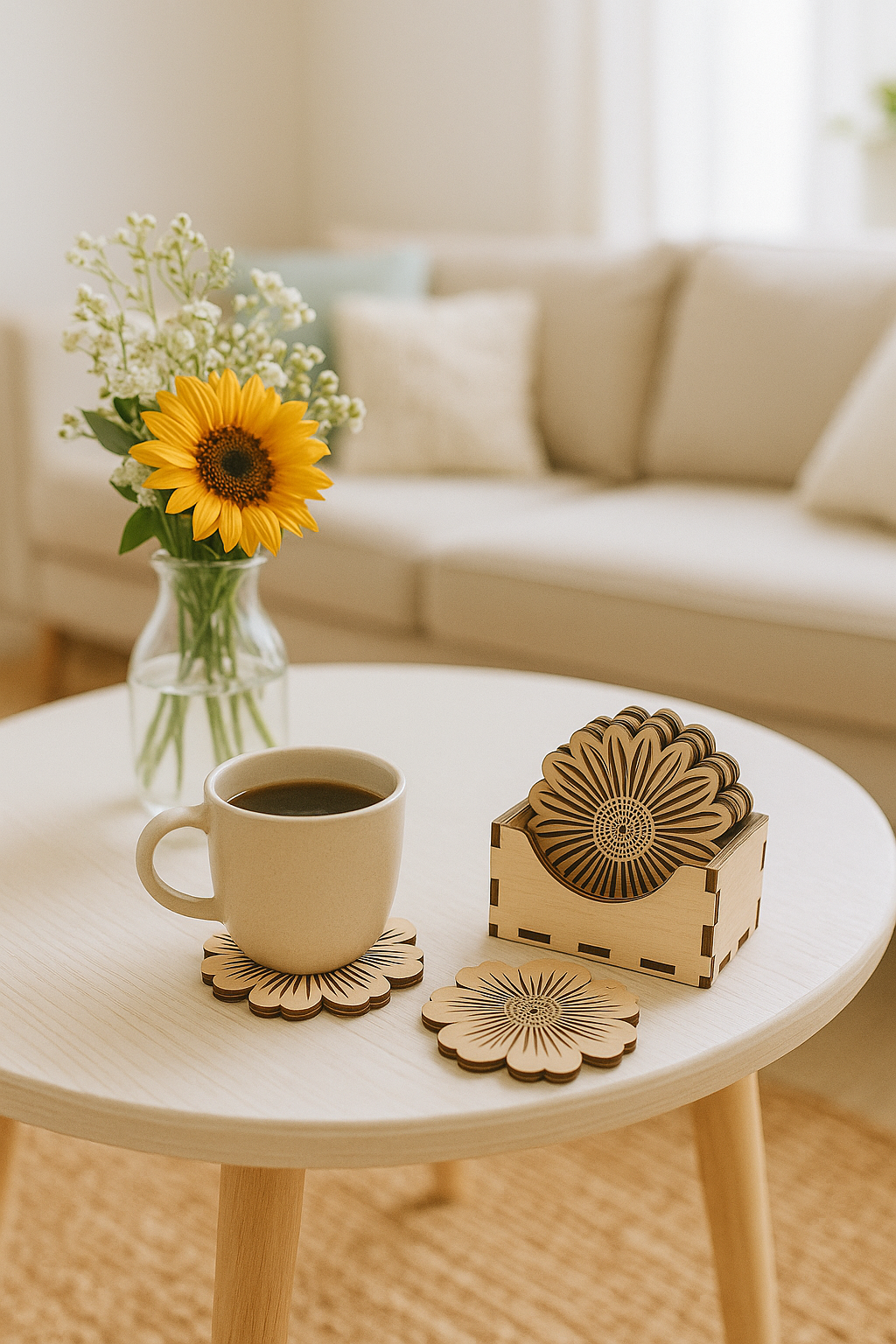Ce set de dessous de verre en bois, finement découpé au laser, apporte une vraie touche naturelle et élégante à ton quotidien. Parfait pour les cafés du matin comme les apéros au soleil !