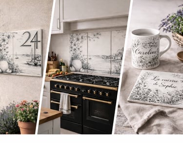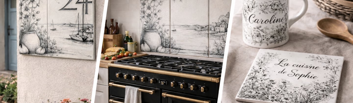 La gravure sur faïence reste peu connue. Elle est pourtant utilisée depuis longtemps dans des contextes où la durabilité est essentielle : cuisines professionnelles, signalétique, murs exposés à l’humidité ou à la chaleur. Ici, le dessin ne repose pas sur une couche décorative fragile : il fait partie du support.