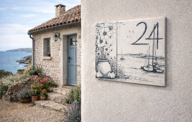 La faïence, elle, reste stable. Numéros de maison, plaques décoratives ou signalétique conservent leur lisibilité et leur aspect sans protection particulière. Le dessin est travaillé pour rester lisible à distance, durablement.