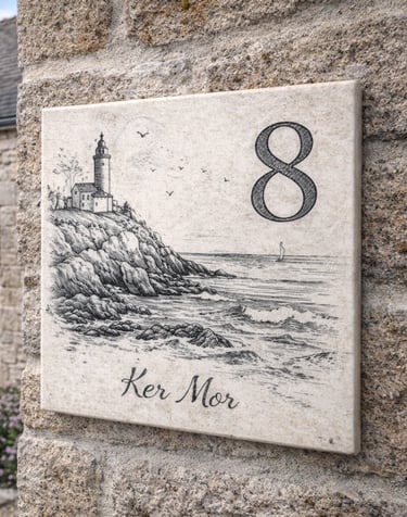 Je prends le temps de comprendre le lieu, son histoire, son usage et les contraintes réelles : intérieur ou extérieur, passage du public, environnement, durée de vie attendue. À partir de là, je conçois une proposition graphique adaptée au projet et au lieu. Le dessin n’est jamais générique : il est pensé pour s’intégrer naturellement à l’espace concerné. Avant toute gravure, le visuel est présenté et validé par écrit.
